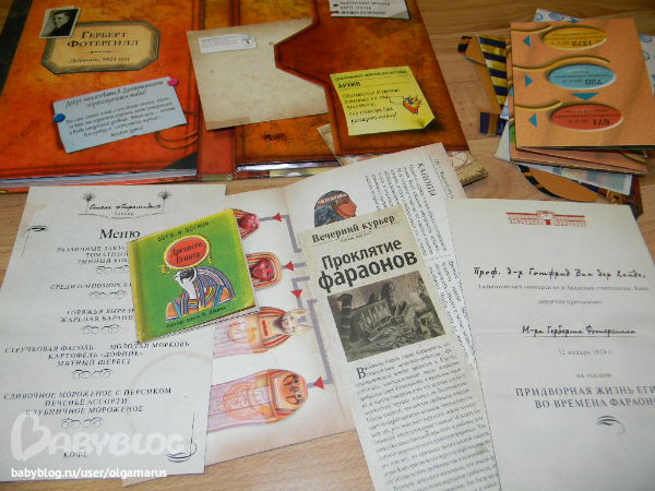 Внутри как буд то папка с материалами и дневник путешественника с разными заметками и записями.