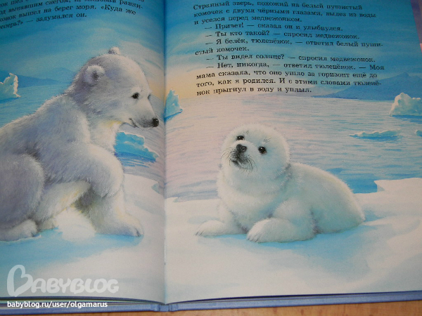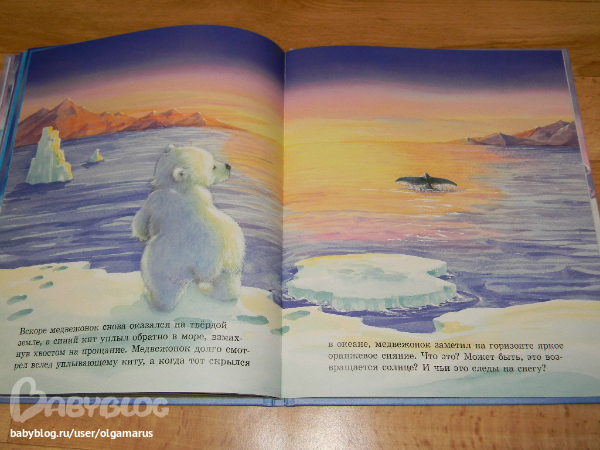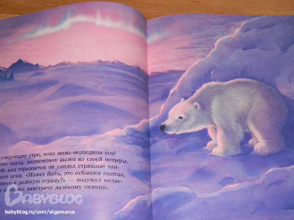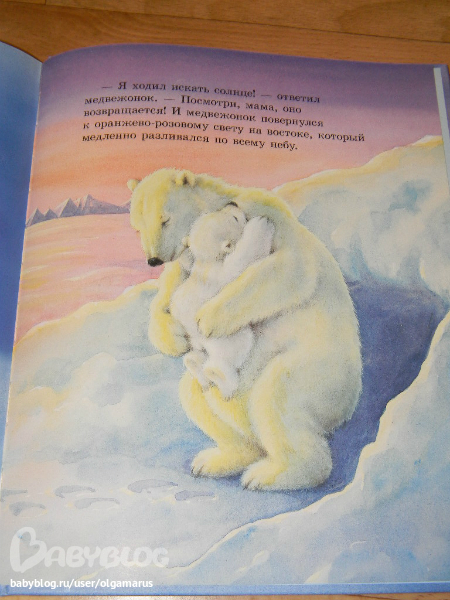 Чудесная добрая книга, с прекрасными иллюстрациями, текст не замысловат, медвежонок отправился на поиски солнышка, по дороге он встретит северного оленя, белька и кита, кит ему поможет и расскажет, что солнышко всегда возвращается обратно. В конце книги интересные сведения о полярной ночи, северном сиянии и животных которых встретил медвежонок на своем пути. Сыну книга понравилась, читаем перед сном почти каждый день, текста в книге не много, подойдет деткам лет до 4 х. К покупке конечно не обязательна но мы не жалеем что купили.