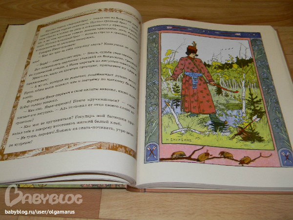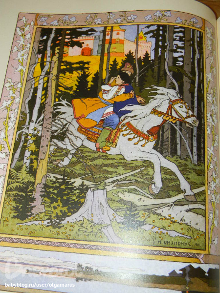 В нашей библиотеке пока не было не одной книги с иллюстрациями Билибина, я конечно не поклонница его иллюстраций, но считаю, что с творчеством Билибина ребенка нужно будет обязательно познакомить, можно было конечно купить несколько репродукций или альбом с иллюстрациями Билибина но я решила купить именно сказки и былины, изучив все варианты что были в наличии в интренет магазинах, пришла к выводу что это на сегодня самый лучший вариант сказок и былин с его иллюстрациями. Ну вот опять я не довольна обработкой некоторых сказок, вот прям беда какая то с этими сказками, не привычные мне обработки попадаются)) Правда не нашла в чьей обработки тут сказки но вот к примеру сказка "сестрица Алёнушка и братец Иванушка" в привычной мне обработке Алёнушку взял в жены купец ну вот небольшой отрывок :