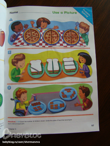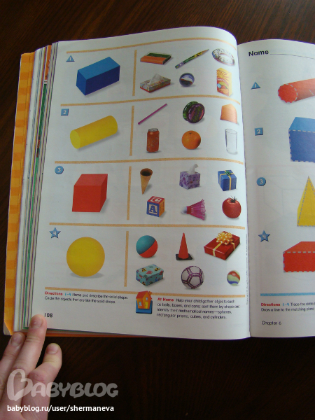 Эта книга расчитана на американских детей пяти лет (К). У нас она и в 4 года идет на ура. Все премудрости, которые хорошо было бы освоить к пяти годам, собраны в полном объеме и разложены по полочкам. На порядок лучше всяких кумонов и скул-зон. Черпаю из нее очень много идей по поводу того, как показать и применить первичные математические знания в быту))). Так и объяснять легче и интереснее. В продаже не искала, так как с завидной периодичностью берем ее в библиотеке))). Санина любимая книга на сегодняшний день. Тем очень много. Выкладываю картинки самого примитивного: