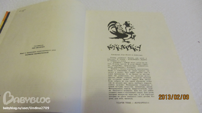 Сказки и комиксы, приключения и небылицы, стихи и истории, картинки и картины, новые писатели и художники - так была анонсирована эта книга в свое время. Мне она очень нравилась, своей необычностью и нвоторством оформления для своего времени. Был обещан выпуск "Ку-ка-ре-ку №2", но у меня его не было. Может есть у кого-то из ББ? Очень хотелось бы посмотреть. Буду рада если выложите на сайте.