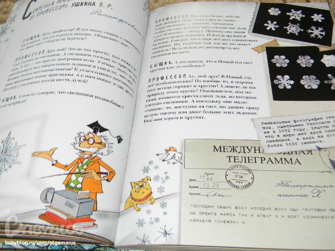 Дальше научная информация о снеге (доступным простым языком написано) из чего снег состоит, почему хрустит, фотографии увеличенных снежинок и т.д.