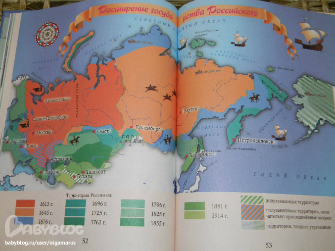 6) Расширение государства Российского. Тут есть карта России с её прежними владениями Аляской, Польшей, Финляндией и СССР. Так же отмечено какие територии присоединились позже а какие территории утрачены. Думаю это нужно знать!