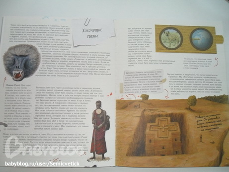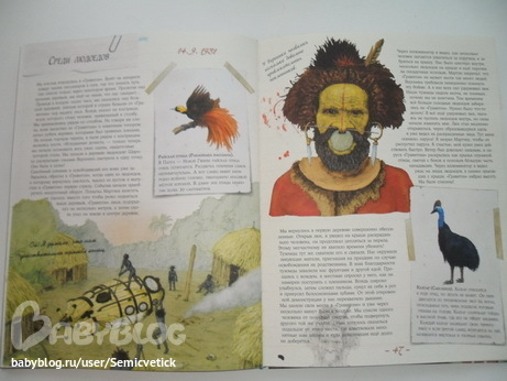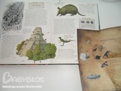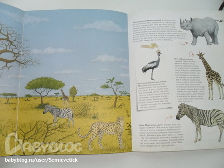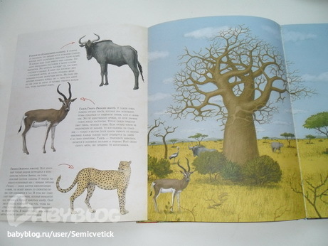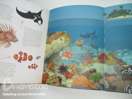 В книге есть 3 раскладывающихся разворота (Африканская саванна, коралловый атолл, леса Южной Америки).