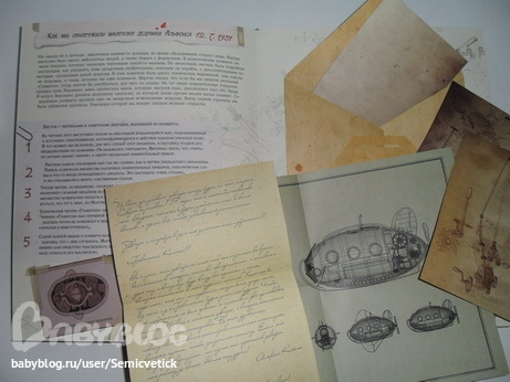 Чертежи, письма, инструкции в наклеенном на странице конверте.