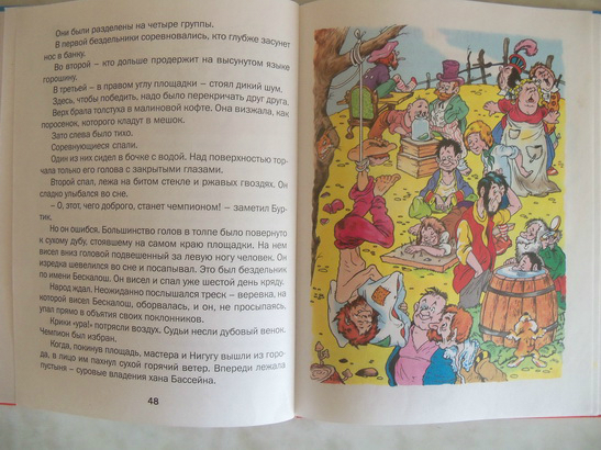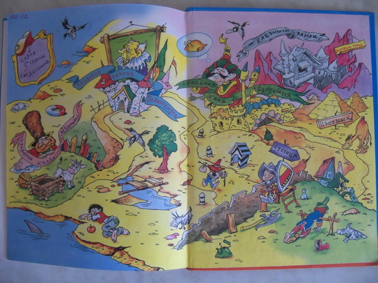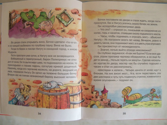 Книга для старших дошкольников-младших школьников, более взрослым навряд ли будет интересна. Это добрая сказка, в которой трудолюбие всегда побеждает лень, а разум торжествует над глупостью. Кратко: в Стране Семи городов жили "люди, которые знали что почем и к любой работе могли приложить руки", то есть мастера и успешные ремесленники. К двоим из них - Гаку и Буртику - когда-то давно попала в руки древняя шкатулка с чертежами неизвестных машин. Мастера не могли разобраться, что это за машины и зачем они нужны, так как все надписи были сделаны на неизвестном языке, который они не смогли понять. Однажды двое подозрительных личностей в зеленых шляпах выкрали у мастеров из шкатулки один из самых интересных чертежей, на котором был изображен какой-то летательный аппарат. Мастера отправились за ворами в погоню и попали в Страну бездельников. Да,да, самых настоящих. В стране никто не умел ничего делать, более того, за работу без разрешения, даже самую пустяковую, там наказывали. Некоторые жители были настолько ленивы, что лежали под яблоней, раскрыв рот, в ожидании, когда же туда упадет яблоко. Многие из них были, к тому же, глупы. Мастера проходят всю страну, преследуя воров, переживают множество приключений, по пути видят сплошную разруху. Суждено им и найти украденный чертеж, и понять, что там изображено, и спасти свою страну от угрозы нападения "бездельников". Мне, взрослому человеку, сразу видно, как автор противопоставляет лень и трудолюбие, глупость и сообразительность, но в книге нет нравоучений и морализаторства, для детей на первый план выйдут приключения героев и различные смешные ситуации. Найдется и друг, который выручит мастеров из беды, когда уже кажется, что все пропало. А какие тут "говорящие" имена - Нигугу, король Подайподнос, князь Мудрила, маркиз О-де-Колон и др. В общем, я зачиталась и забыла, что собиралась идти варить суп! Поэтому сейчас быстренько покажу вам несколько картинок и побегу варить.