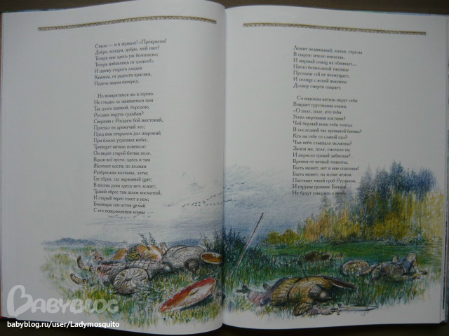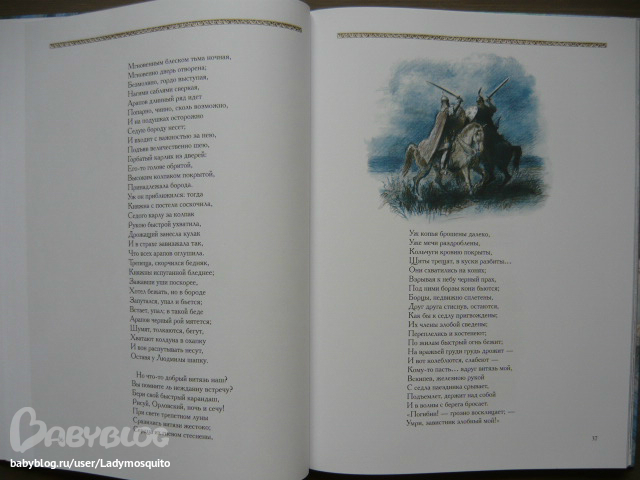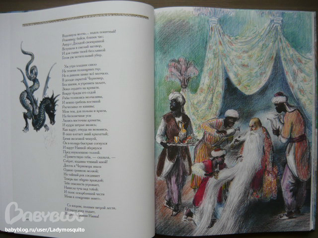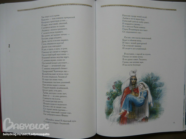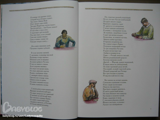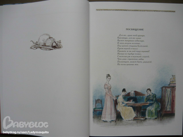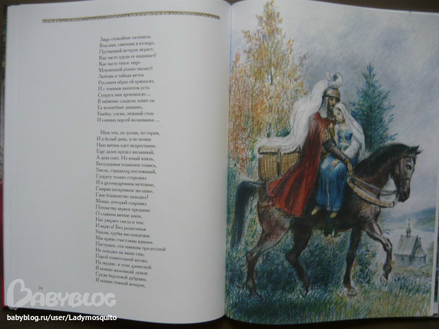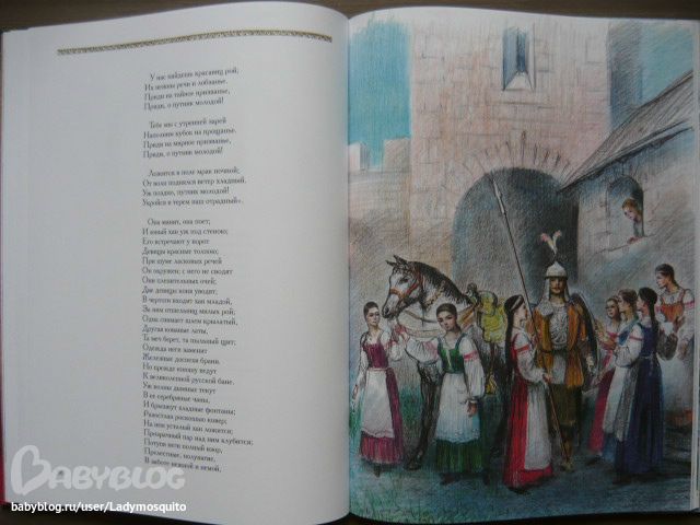 Сфотографировала не всю книгу, сначала подряд странички, чтобы понятна стала идеология иллюстрированния книги, а потом, в основном, полностраничные иллюстрации. Предлагаю полюбоваться! Вся тональность иллюстраций создает романтическое, пахнущее свежими летними сумерками настроение. И вот с этим настроением - да в богатый текст Пушкина! Непередаваемые ощущения: