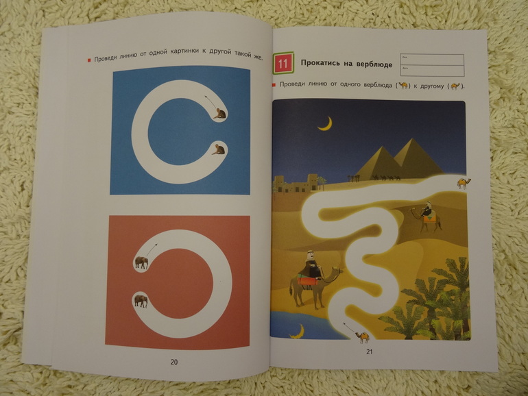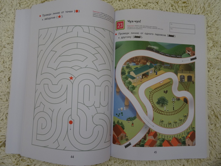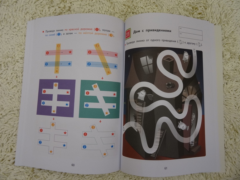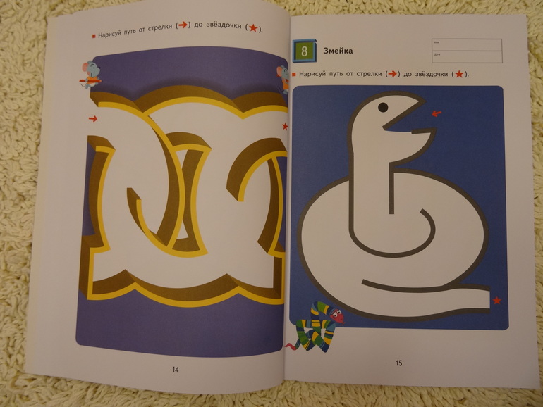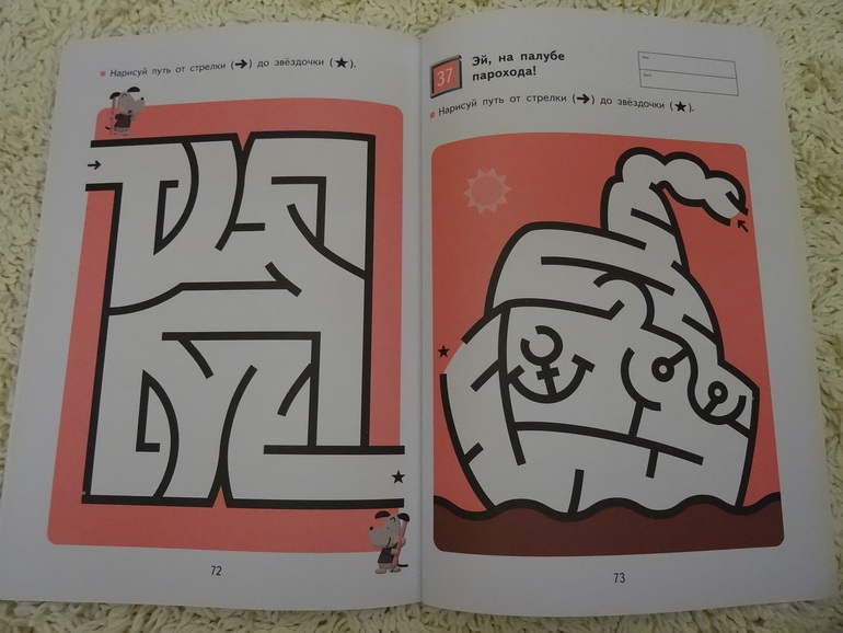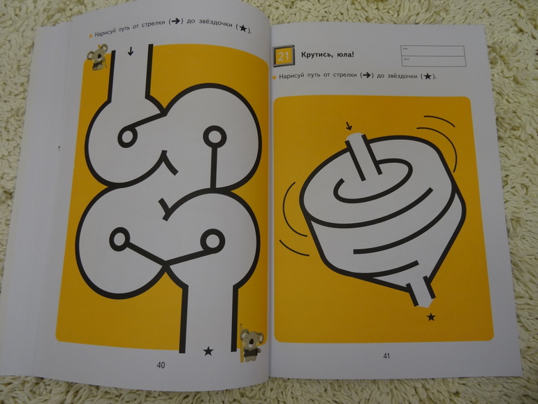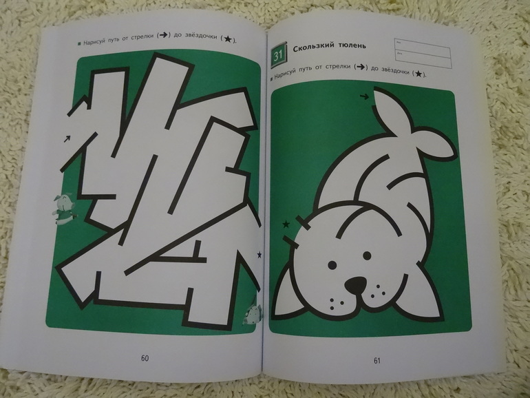 К тому же книга достаточно толстая, как альбом не раскладывается, поэтому элементарно ребенку неудобно чертить дорожки. А если все-таки ее разложить, то странички оторвутся. Сначала меня это расстроило, а потом обрадовало =)