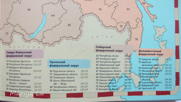 На форзаце регионы расположены по федеральным округам,на нахзаце указаны в алфавитном порядке. Кроме того Регионы на разворотах располагаются в порядке удаления с запада на восток.