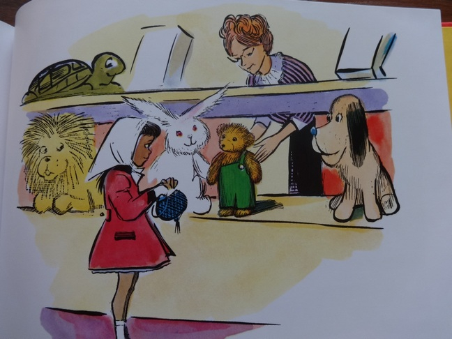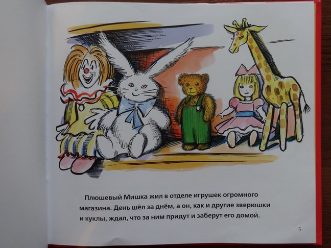 История очень проста - мишка стоял на полочке в магазине и ждал, когда же его купят, т.к. очень хотел обрести друга. Наконец, его заметила девочка ("Ах, мамочка! - воскликнула она. - Посмотри! Это тот самый мишка, о котором я всегда мечтала!"), но мама отказалась мишку покупать, сказав, что нет сейчас денег, да и вообще мишка наверное уже не новый - у него не хватает пуговицы на штанишках. Мишка очень огорчился и ночью, когда закрылся магазин, отправился на поиски потерянной пуговицы. А утром та же девочка опустошила свою копилку и пришла в магазин за мишкой. И мишка, и девочка довольны и счастливы. Вот и всё. В целом история подойдет для двухлетних малышей, она интуитивно понятна даже без текста, просто по картинкам. Но такая она получилась милая, теплая, нежная, что моя любительница мишек часто выбирает эту книжку для чтения, иногда сама листает (уже и следы от пальчиков на страничках остались). Я на полку в шкаф книгу не ставлю, чтобы поближе лежала ))). История о дружбе, о том, что желания исполняются, если очень захотеть.