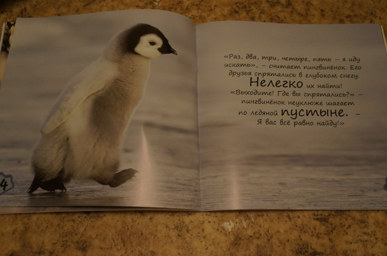 Самая долгожданная книга - книжка о Пингвиненке. Ее я очень долго искала. Удивительная тонкая книжечка с настоящими фотографиями пингвинов и познавательной историей о их жизни. Странички плотные и мелованные.