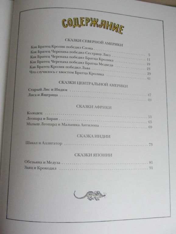 В книгу вошли сказки Северной и Центральной Америк, а также по нескольку сказок Африки, Индии и Японии. В ней мы встречаем уже знакомого нам хитроумного братца Кролика, да и другие сказки оказались знакомы с детства, если не по книгам, то по советским м/ф уж точно. Сказки добрые и поучительные.
