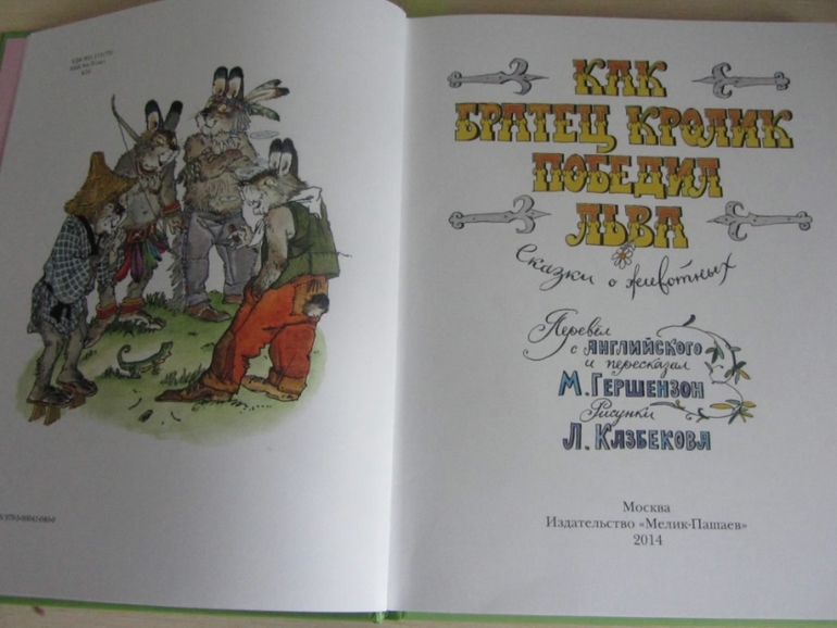 Сказать по правде, книгу "Как братец Кролик победил Льва" в своем детстве я не читала и покупаю книгу для сына, я полагала, что её автором также как и предыдущей является Харрис... Но кто автор англоязычной версии - в данном издание понять не возможно. Зато переводчик/перезказчик тотже великолепный Михаил Гершензон, а иллюстратор Латиф Казбеков. И я считаю, что такое сочетание - великолепно.