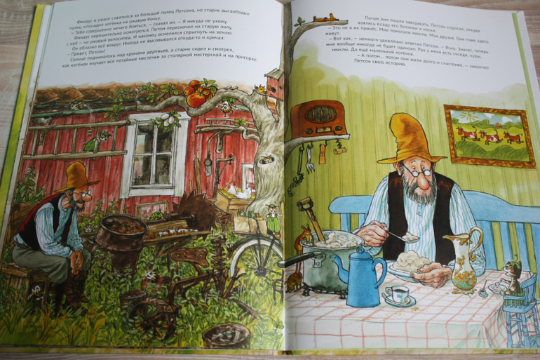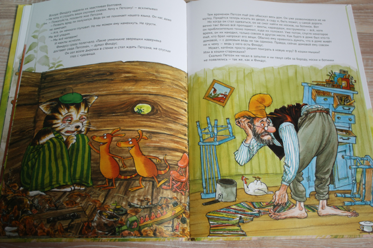 Купила книгу,когда 3х не было. Мне показался сложным стиль повествования,такой заунывный немного.В самом деле,повествует же старик-зануда Петсон). Сын заинтересовался книгой после 3х и теперь у него любовь-любовь.И мультики смотрит и новые книги покупать просит,и по картинкам сам "читает",рассказывает,что у них там происходит.Конечно,ребенок видит в озорном котенке себя.