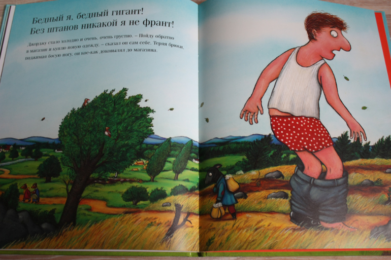 На данный момент,эта книга последняя из имеющихся и обожаемых из Дональдсон. Покупала еще Тимотти Скота,Улитку и кит-первый совсем не пошел,передарила,вторая-читаема,но не обажаема.Планирую из всей серии купить еще Зайчика-сочиняйчика,Человеткина,Дочурку Груффало и все.Эта более мальчишеская ,по-моему. Про великана,который в новом магазине для великанов приоделся,но по пути домой раздал зверям свои обновки для спасения,за что они его отблагодарили.