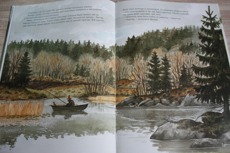 Осення тематика,красивущая картина осеннего леса и речки. Мы любим ездить в лес и на рыбалку,от книги прямо веет туманной дымкой,пожухлой листвой и хочется хандрить с Петсоном,и чтобы веселый котенок тебя тормошил)