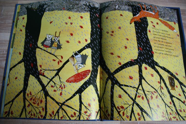 Книга так сверстана,что текст читаем ,когда главный герой перед нами вниз головой,но при этом весь нарисованный мир перевернут.Вертим и так,и так))Фледолин-летучая мышь,которая не висит вниз головой,но в этом есть плюсы.Например,он видит,когда на стаю летучих мышей охотиться лиса и предупреждает своих сородичей.