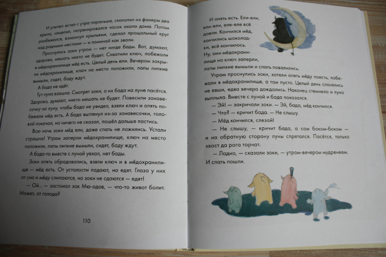 Это наше нынешнее чтение.Книга 4+,можно сказать первая сложная.Здесь картинки не иллюстрируют каждый шаг героев,но они красивые акварельные и много на весь разворот.Есть сложная игра слов,понятная полностью наверно действительно после 4,а то и старше-подмена букв и словотворчество,дающее новый смысл словам.Но,сами истории настолько веселые,простые,что сын просит читать ее вот уже неделю с дня покупки по два раза в день,несмотря на то,что это новый формат чтения для него-без слежки по картинкам.А еще муж ложиться слушать про Зоков,такая семейная книжка получилась.