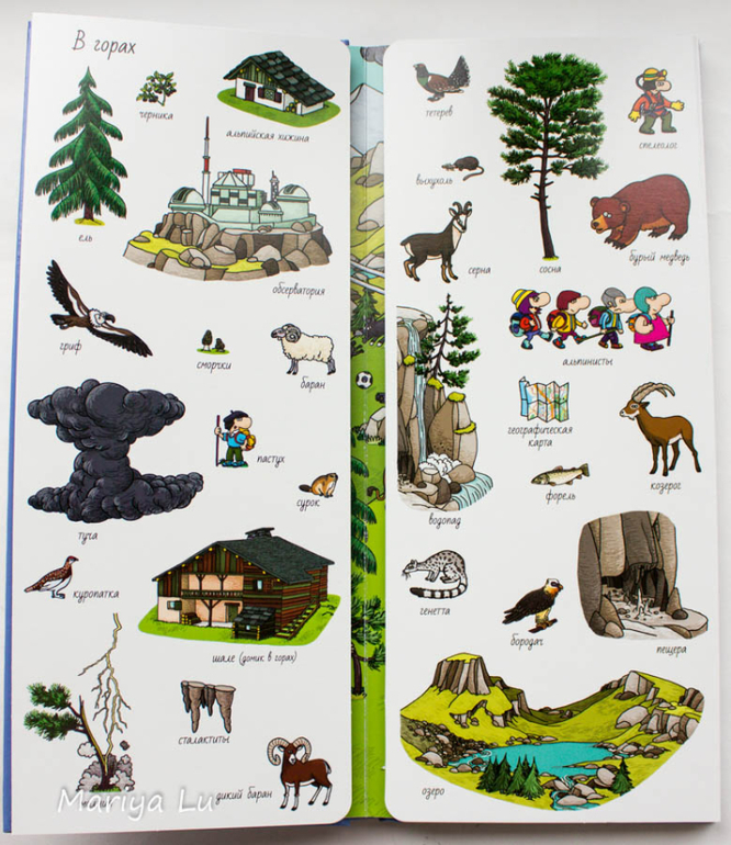Формат книжек что ни есть-самый удобный. Можно с легкостью взять с собой. А вот когда раскроем книгу и откроем створки-развороты, то размер получится приличный. Глаза не устанут рассматривать:) Тем более картинки яркие и четкие. Развороты не перегружены деталями. Хоть везде и указано,что страницы картонные,но обольщаться не стоит,т.к. картон не плотный. Хотя за те месяцы,что одна из книг была в активном чтении с ней ничего не случилось. Только на сгибах страниц белые полосы появились,да и это произошло практически сразу.
