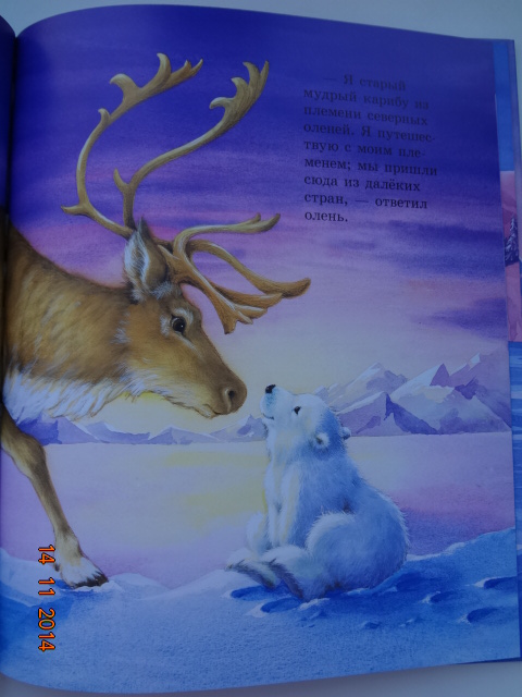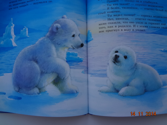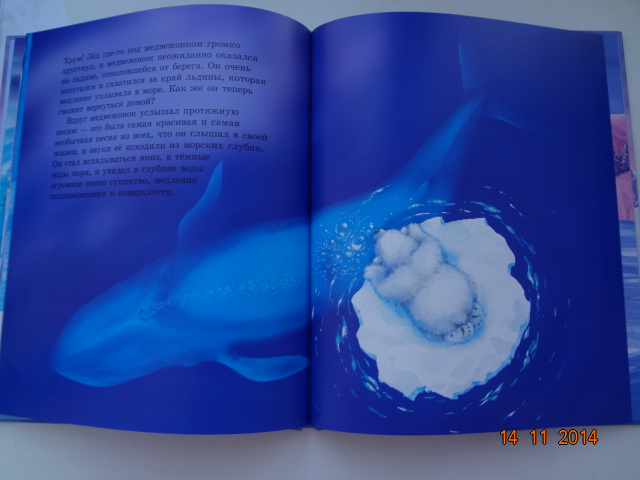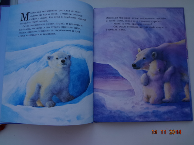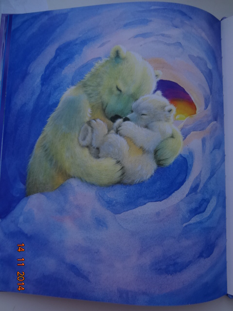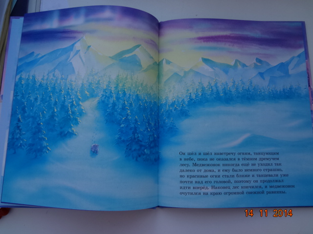 Потрясающие иллюстрации,страницы наполнены северным сиянием, белизной снега, синевой воды... Текст мне показался вторичным, он не плох. История для малышей о том, как медвежонок пошел искать солнце. На пути он попадал в приключения, но в конце концов вернулся к своей маме! Сюжет напоминает многие книги, на ум пришло "С кем обняться медвежонку?" (Дуглас тоже ходил, попадал в приключения и потом вернулся к маме), "Спокойной ночи, солнышко" (там про зайчика, который никак не хотел спать) и др.
