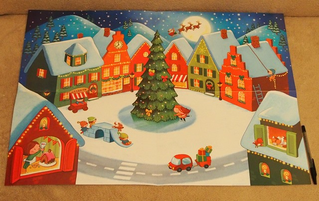 4. Веселая забава на Новый год - плакат Новый год в сказочном городе. Это большой плакат (скорее формата А2) на котором изображен заснеженный городок с елкой в центре площади и 45 многоразовых наклеек, которые можно переклеивать хоть каждый день, создавая заново веселое настроение. Когда открываем книжку, на первом развороте стихотворение про зиму Саши Черного. По иллюстрации предлагается составить небольшой рассказ (для более взрослых детишек)