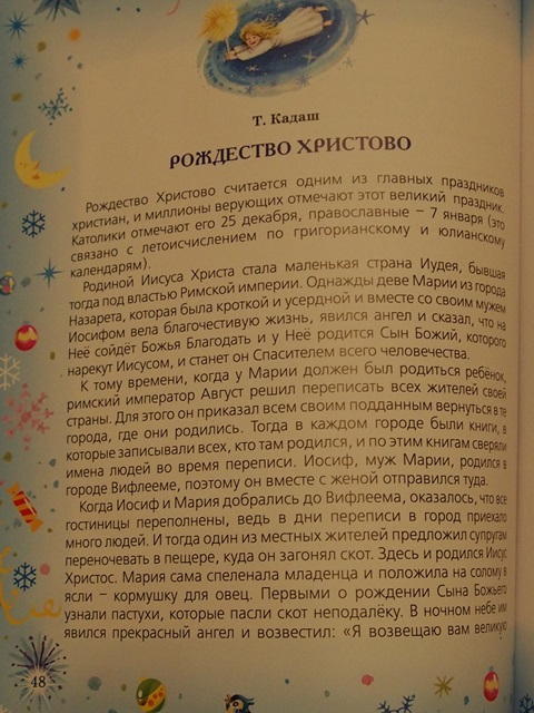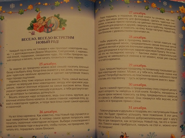 И вот, она у нас. Я счастлива :). Для знакомства ребенка с праздником самая интересная книжка. Тут и стихи Сурикова, Александровой, Пушкина, Барто, Некрасова, Усачева и других авторов; и рассказы 12 месяцев, Морозко, Мороз Иванович. Для детишек постарше есть страницы с загадками, играми (найди отличия). Несколько страничек с информацией, почему мы празднуем этот праздник и как его празднуют в других странах. И как бонус - рецепты рождественского печенья :).