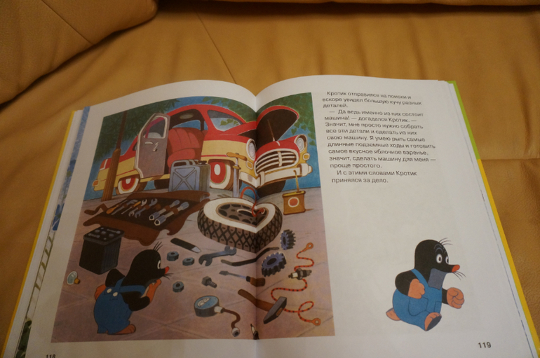 3) Кротик большая книга Майшоп Книжка очень хорошая, появилась у нас в 2 года (нам 2,1), сразу заинтересовал рассказ кротик и автомобильчик, другие прочитали по разу и все. Читал пару недель, заставлял всех читать, рассматривал все запчасти и инструменты, переварил, пока не хочет ее читать. Но думаю у нее еще есть будущее!![]()