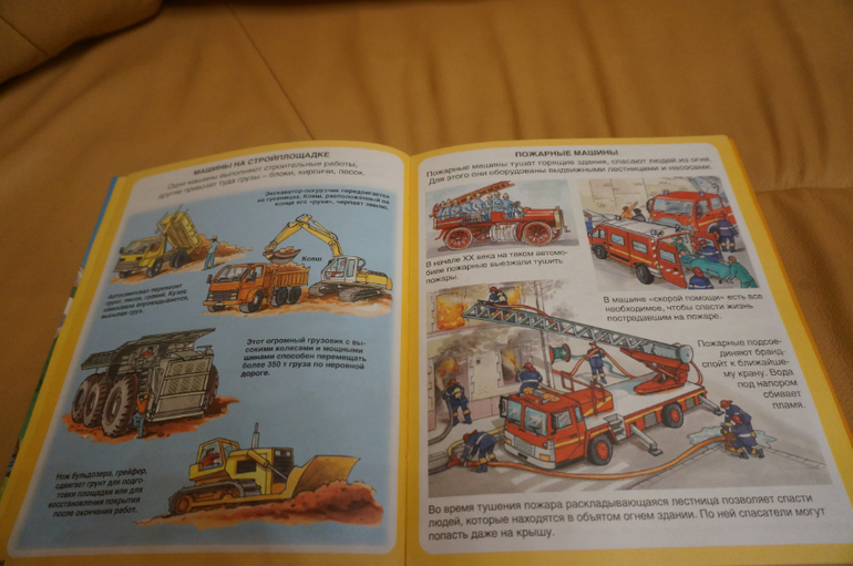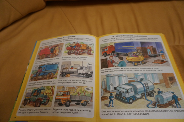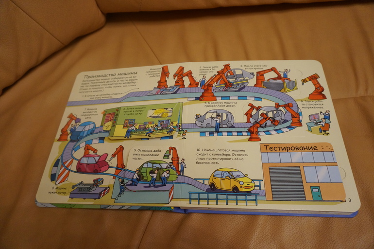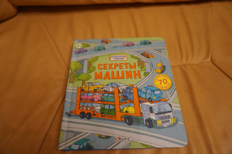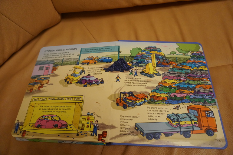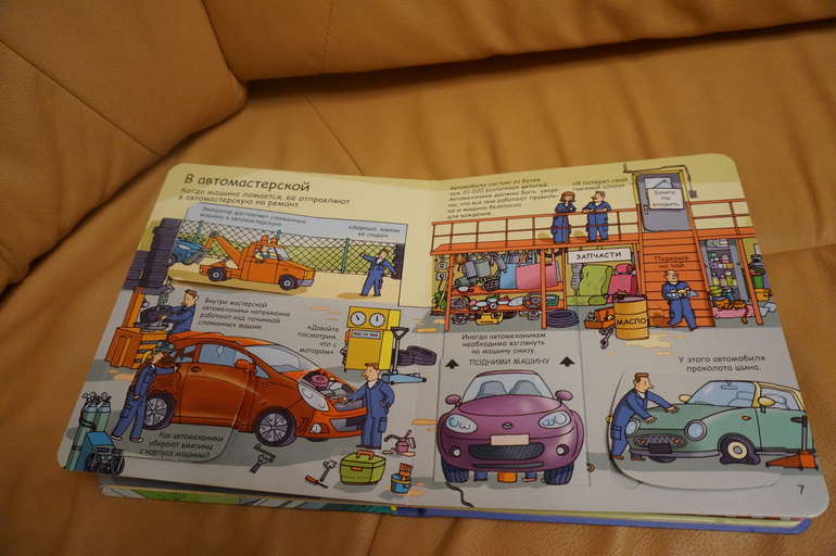 Появилась у нас в полтора года, папа купил сам, в ней волшебные створки, которые так любят дети. Очень красочное и понятное издание, сама узнала много нового про машины, читаем ее очень часто, пару створок уже оторвали.на каждой странице своя тематика, 7 разворотов: