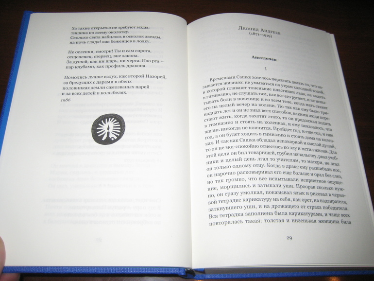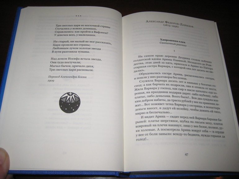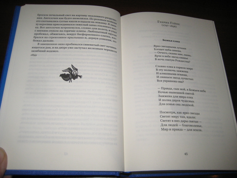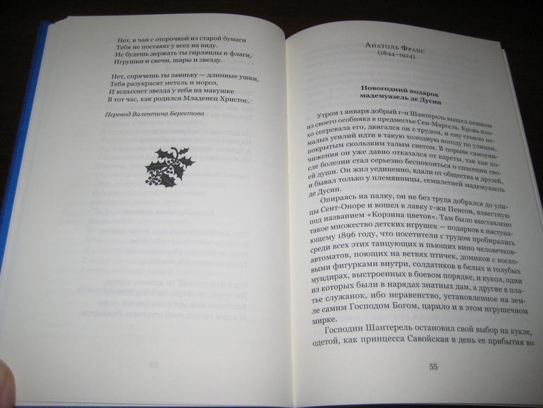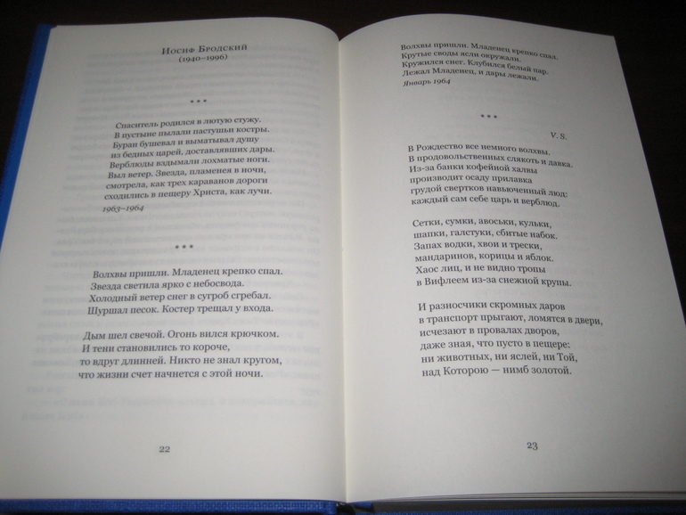 Книга НЕ новогодняя, а именно рождественская. Я ее все с "Рождественской елкой" ИДМ пыталась сопоставлять - ну очень, очень они разные. И в концепции своей, и в плане содержания, и в плане оформления. "Рождественская елка" преимущественно ориентирована на получение эстетического удовольствия, у меня все время от нее ощущение, что текст там отходит на второй план, теряется за всеми этими рождественскими открытками... Тут же дело другое: содержание настолько богатое, что каждый может выбрать то, что ему по душе, читать буквально из любого места, хоть стихи, хоть прозу, хоть отечественных авторов, хоть зарубежных :) Я загадала и у меня открылась книга на Бродском :)