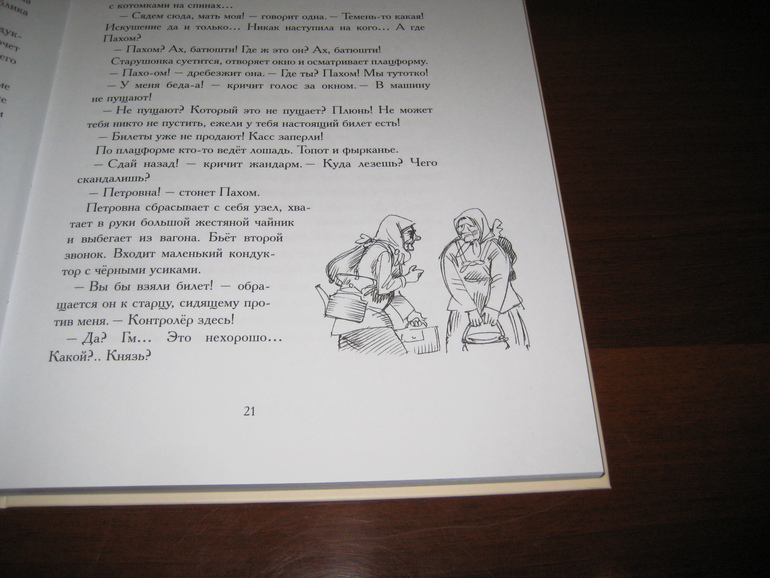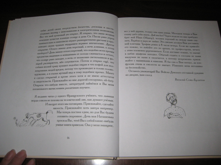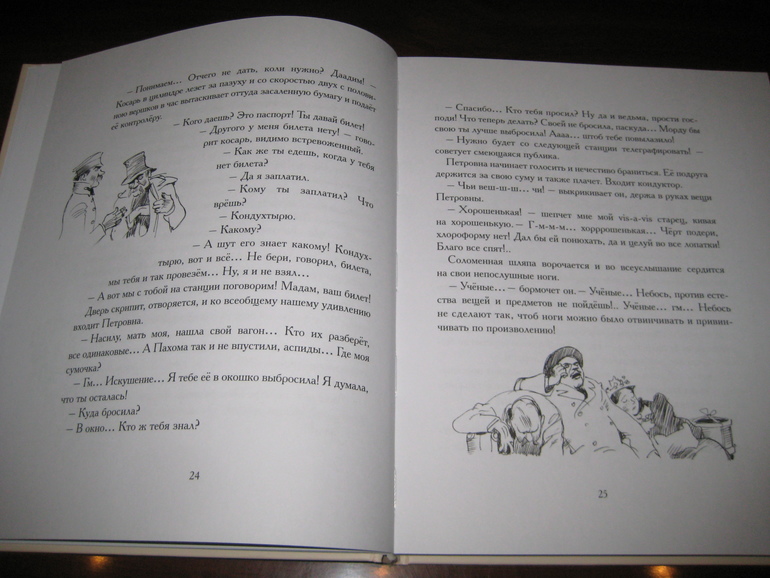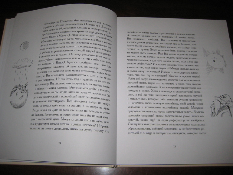 На фото это не очень видно, но шрифт НЕ мелкий, достаточно крупный для недетской книги. Плюс он черный на белом, читать очень комфортно. Поля широкие, значительно увеличенные, само по себе это не было бы оправдано, но на них зачастую запрыгивают рисунки, разбивая строгость текстового столбца и вызывая улыбку :)