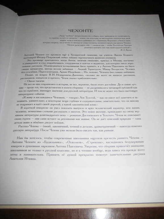 В предисловии приводятся слова И.А. Бунина о том, что "люди "идейные" интересовались им, в общем, мало: признавали его талантливость, но серьезно на него не смотрели, - помню, как некоторые из них искренне хохотали надо мной, юнцом, когда я осмелился сравнивать его с Гаршиным, Короленко, а бывали и такие, которые говорили, что и читать-то никогда не станут человека, начавшего писать под именем Чехонте: "Нельзя представить себе, - говорили они, - чтобы Толстой или Тургенев решились заменить свое имя такой пошлой кличкой"".