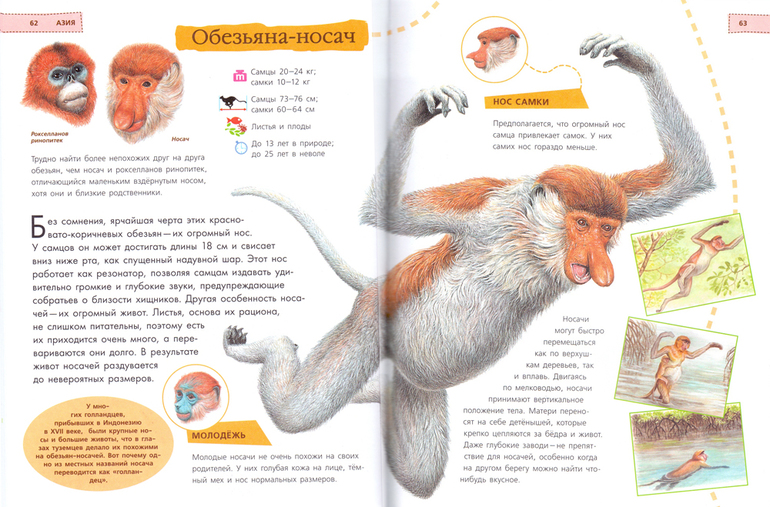 Мне очень понравилось в этой энциклопедии, что на каждом развороте есть сравнение животных, я еще не встречала такого в энциклопедиях - например тут наглядно видно, что амурский тигр больше бенгальского.