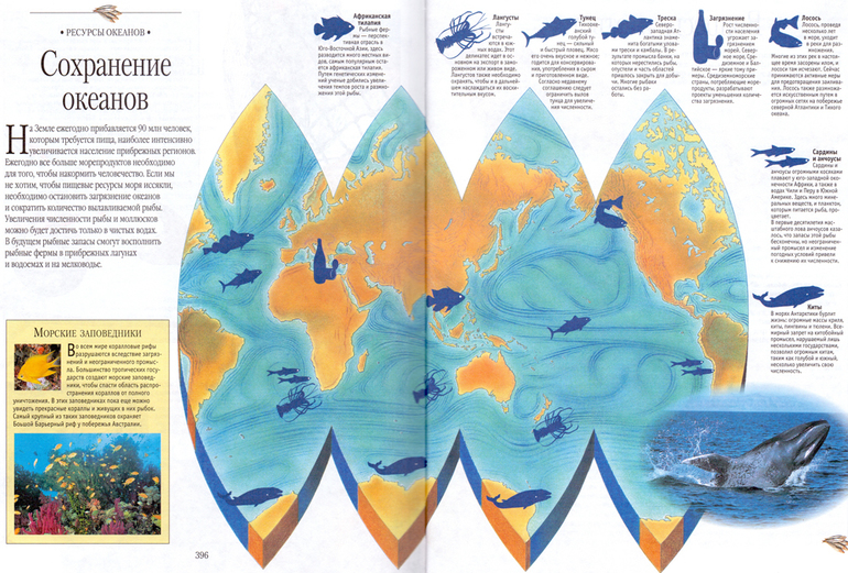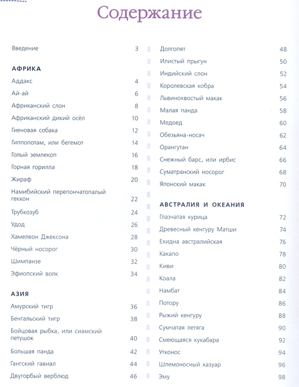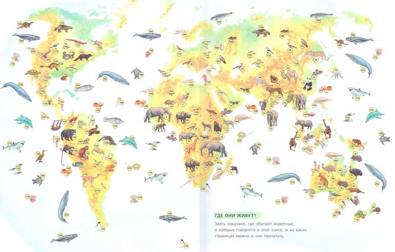 На форзацах показана карта мира, где отмечены места проживания животных и номера страниц в книге, где можно прочитать об этих животных![]()