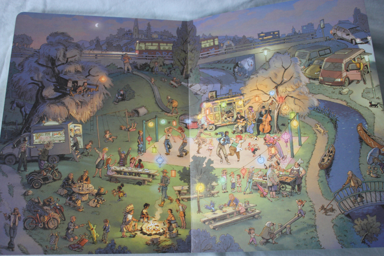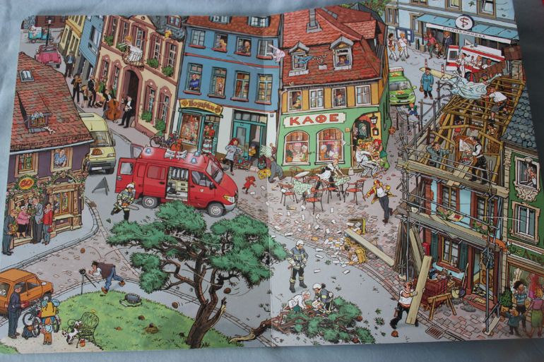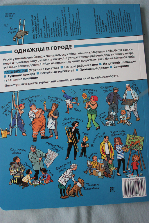 Книга "Однажды в городе" получилось очень насыщенной и охватила множество ситуаций, которые подстерегают нас ежедневно - утренняя суматоха, начало рабочего дня, вкусные кексы в кондитерской, тушение пожара (тьфу тьфу тьфу все ж не каждый день, но иметь представление об этом надо), стройка, распродажа и скидки в магазине, детская площадка, свадьба... Все очень интересно! На каждом квадратном сантиметре книге множество деталей достойных для обсуждения. Каждый раз рассматривая эту книгу, можно придумать все больше и больше историй, и каждый раз это будет что-то новое, про других героев и их жизненные ситуации. Очень достойная книга.