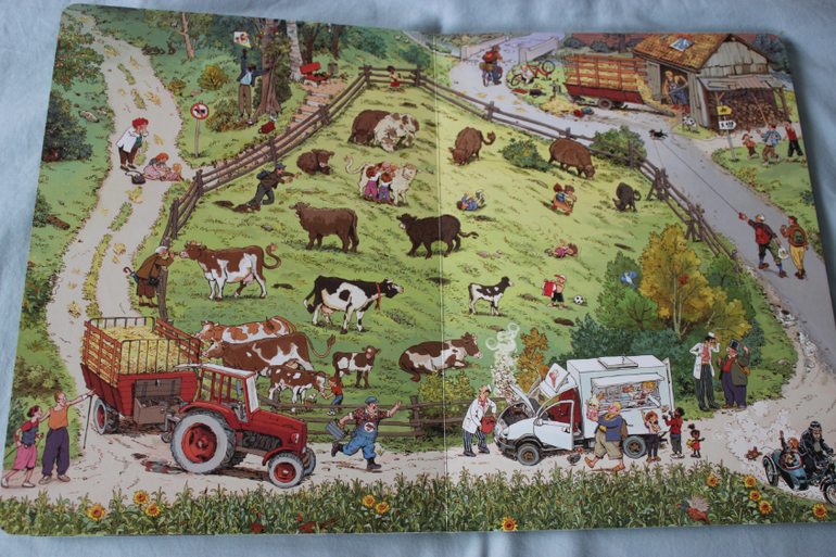 Во-первых, рисунки хоть и простые, но очень достойные и реалистичные, изображения с выраженным задним и передним планом. Во-вторых, "мельтешащих" элементов в меру, и они не наслаиваются друг на друга, т. е. каждого персонажа и деталь можно выделить и рассмотреть внимательней.
