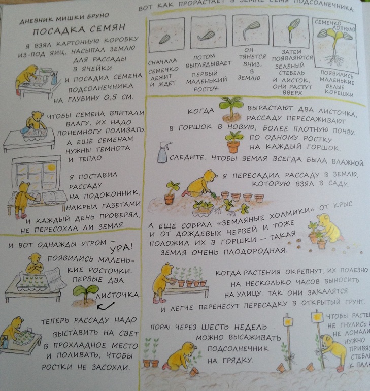 Мишка Бруно покажет записки из своего дневника наблюдений за природой. Весной возвращаются перелетные птицы, создают пары, самцы привлекают своими трелями самок, самки вьют гнезда и откладывают яйца, греют их своим теплом, а проклюнувшихся птенчиков кормят личинками. В весеннем лесу встречаются проснувшиеся букашки, муравьи. В ручье водяные крысы чистят норы от земли, которой заделывали входы. Время садить семена , и Бруно даст совет, на какую глубину посадить семечко.