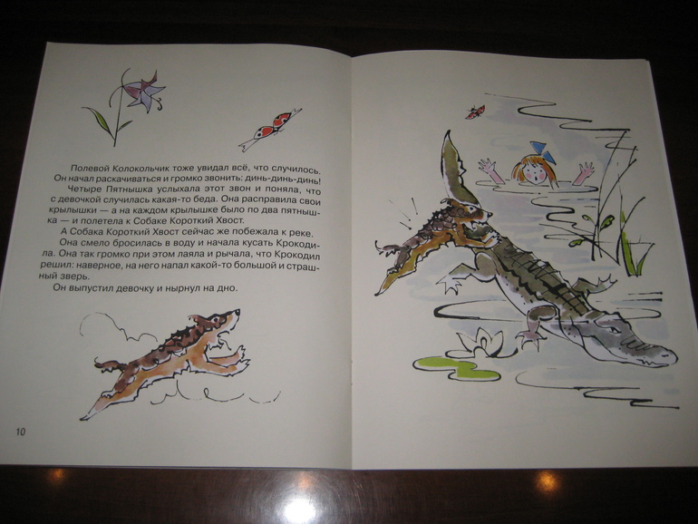 Вот здесь я все думала, почему же Крокодил - не обычный, ярко-зеленый такой Крокодил, а темный, болотный какой-то, это самая темная иллюстрация. Возможно, подумалось мне, таким образом подчеркивается его негативная роль в сказке и опасность самой сцены: