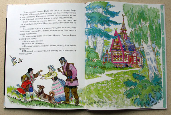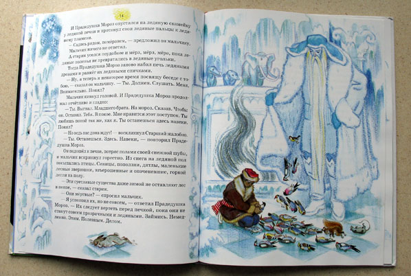 Вторая из них - это "Два брата" Евгения Шварца. Вначале я её прочитала сама. Тронула она меня до глубины души. Не знаю как у кого, а у нас бывают моменты когда старший брат выставляет за дверь младшего, потому что тот ему мешает. Но почему-то я долго колебалась над прочтением этой книги со старшим сыном. Как-то пугал меня Прадедушка Мороз, замораживающий всех и вся. Да и книга сама такая переживающая. Но в один из холодных вечеров марта мы таки её осилили. Причём прочитали сразу целиком, было видно как захватило сына, он переживал и не хотел останавливаться пока не узнал, что всё хорошо закончилось. Признаюсь, честно, ничего подобного мы ещё не читали. И если я раньше сомневалась над приобретением этой книги и уже больше года она лежит в отложенных, то теперь все сомнения полностью развеяны. Иллюстрации Н. Кочергина просто идеально дополняют сказку.