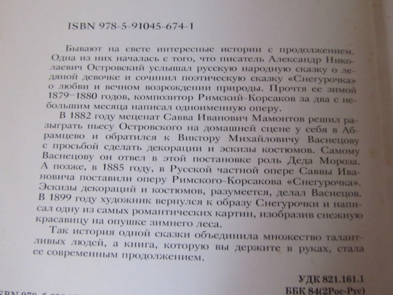 Книга просто завораживающая и конечно в большей степени благодаря великолепным иллюстрациям Васнецова, ТОГО самого который написал "Три богатыря". В книге в качестве иллюстраций использованы рисунки эскизов костюмов созданных Васнецовым для пьесы, где он кстати сыграл Деда Мороза.