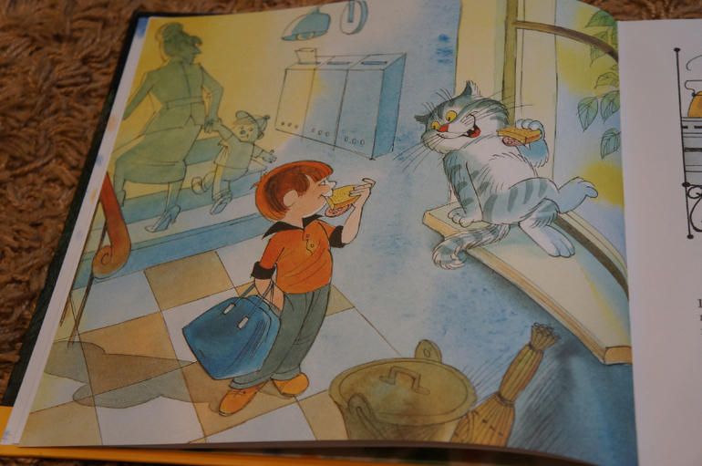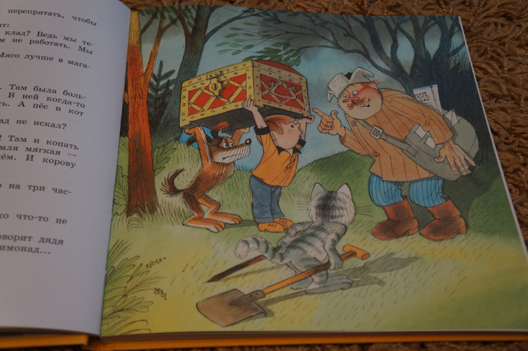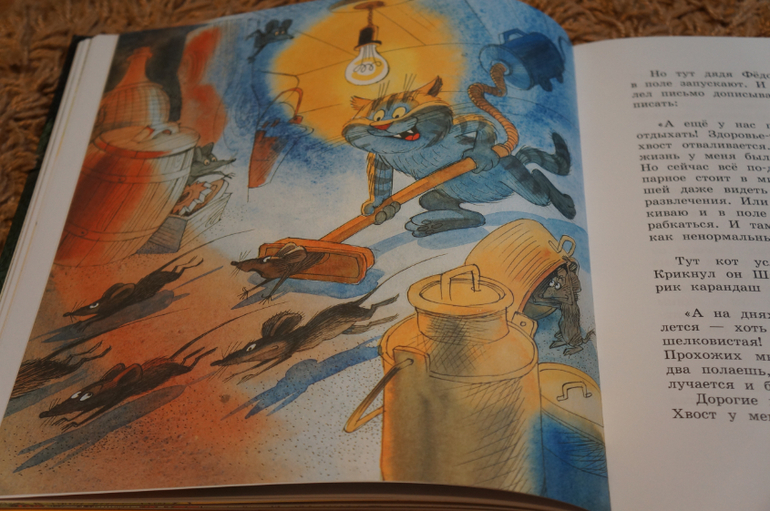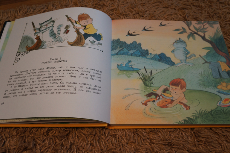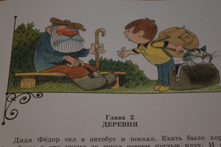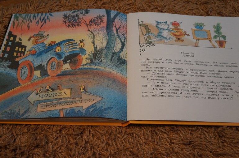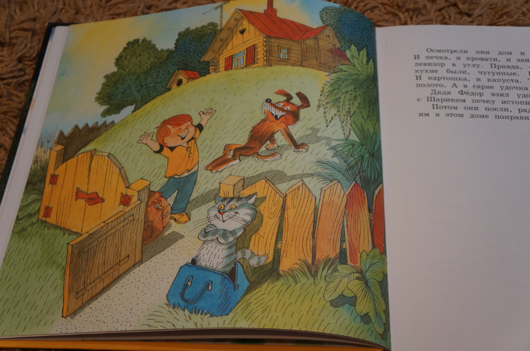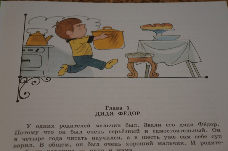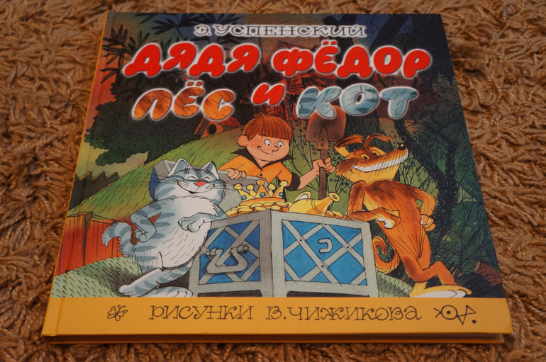 Купила такого же, с Чижиковым. Но немного пожалела что не взяла мультяшного. В этой книге все таки много разворотов без иллюстраций. Просто мультяшные что есть в продаже — качество не очень. Картинки сильно отфотошопленные, цвета ядовитые (как минимум так это выглядит на сканах). Если у кого то есть мультяшный дядя Федор которым они довольны, была бы благодарна за ссылку )