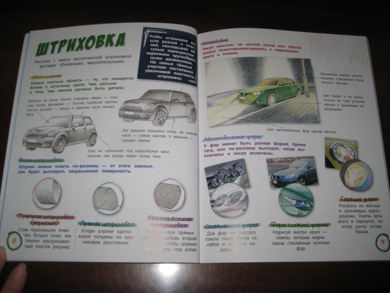 Знакомимся с понятиями света и тени и видами штриховки, а также разновидностями "машиньих глаз", то есть фар.