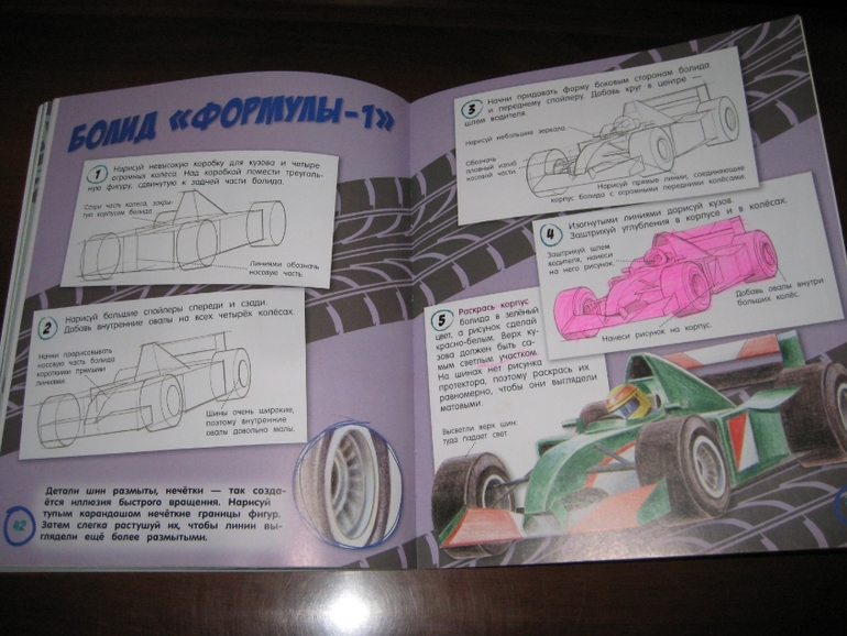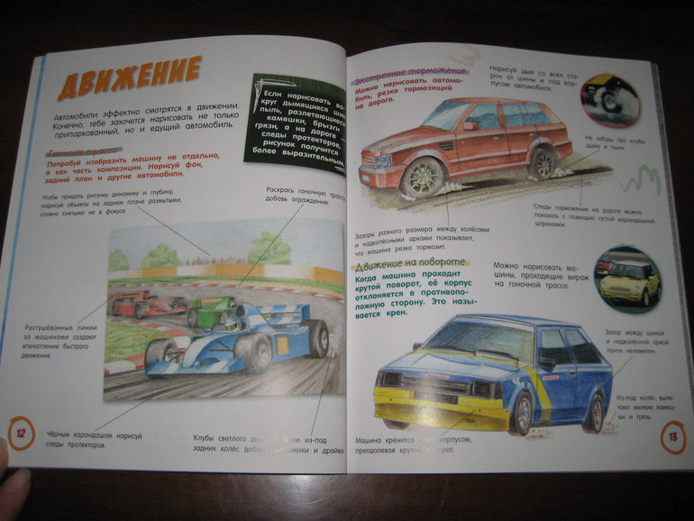 Помимо формы у рисунка есть еще две важнейших характеристики: цвет и текстура. Посмотрите, как обстоятельно подходит к этому вопросу автор, обращает внимание на нюансы, например, показано, как изобразить отражения, с помощью каких средств сделать автомобиль чистым или грязным.