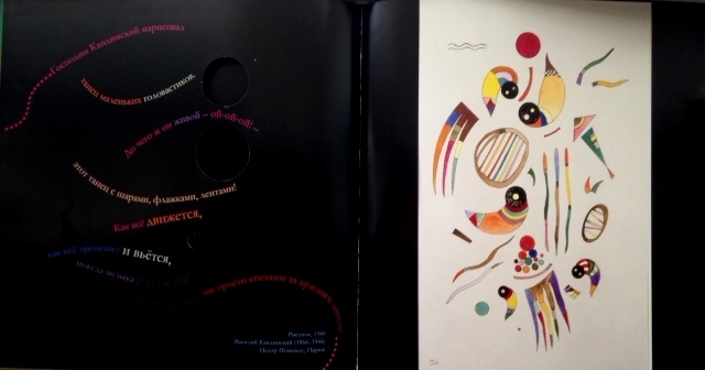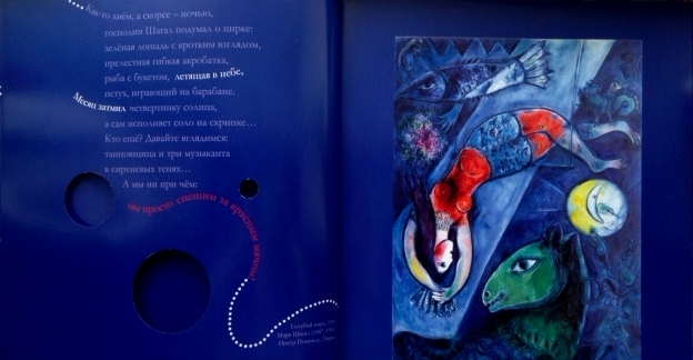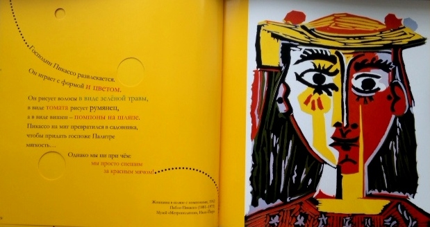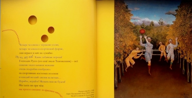 Каждая картина сопровождается стихотворением-комментарием Михаила Яснова с субъективной оценкой идеи картины, но оно очень задорное, забавно преподносит нам посыл художника или эмоции от увиденного. Вот пример стихотворения к картине Анри Матисса «Икар»