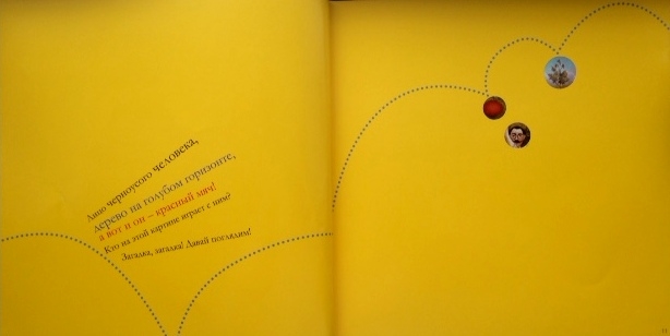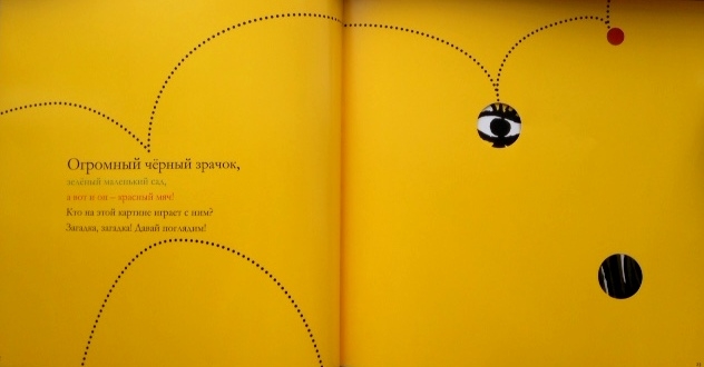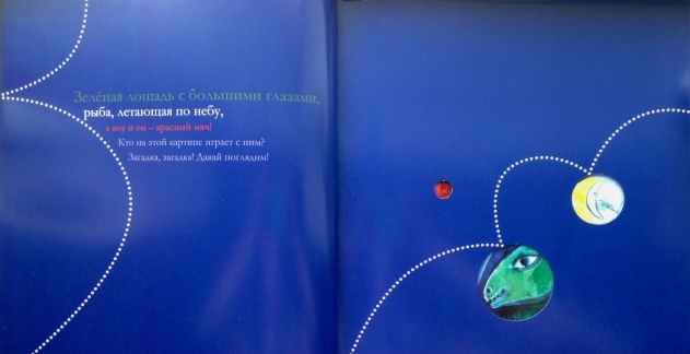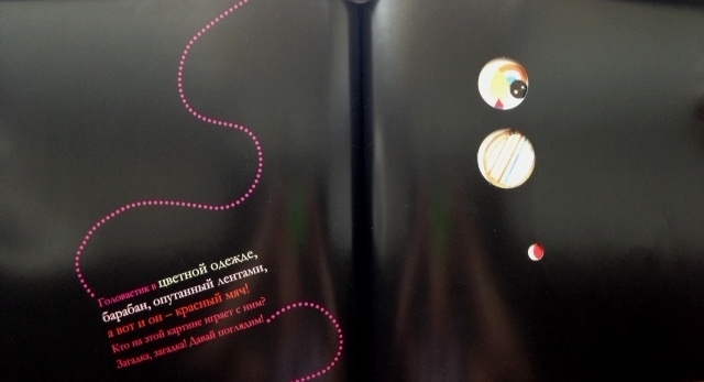 На одном развороте мы видим стихотворение-загадку и несколько дырочек, через которые видны элементы картины со следующего разворота. Один из элементов - обязательно красный мяч, а точнее круг, который присутствует на картине. Когда мы переворачиваем страницу, то внимание наше рассеивается, и нужно приложить некоторое усилие, чтобы найти элементы, которые мы увидели в дырочках на предыдущем развороте. Отличная тренировка внимания и концентрации.