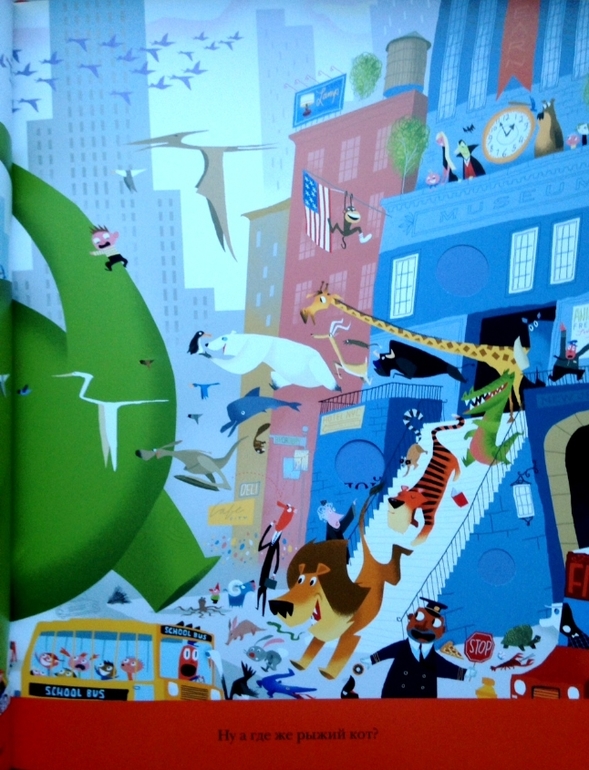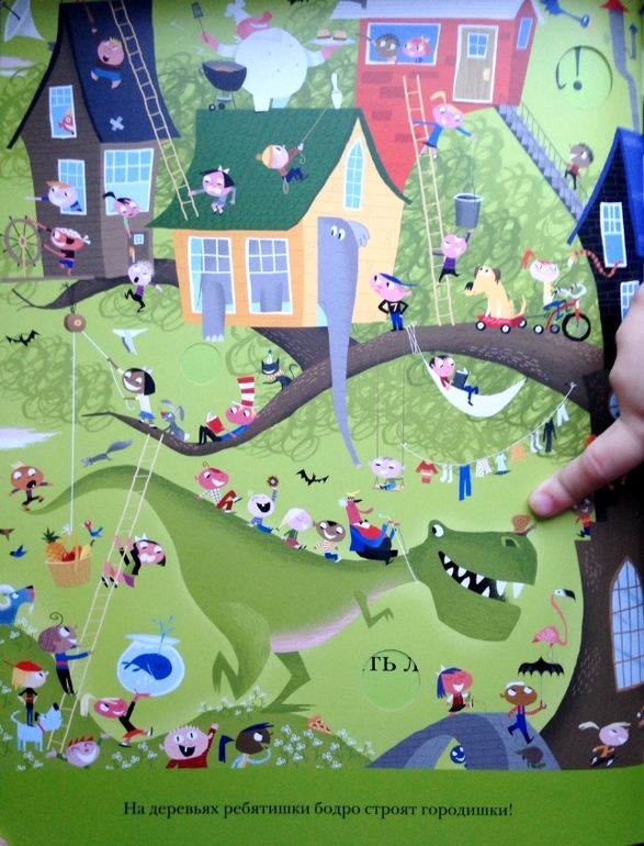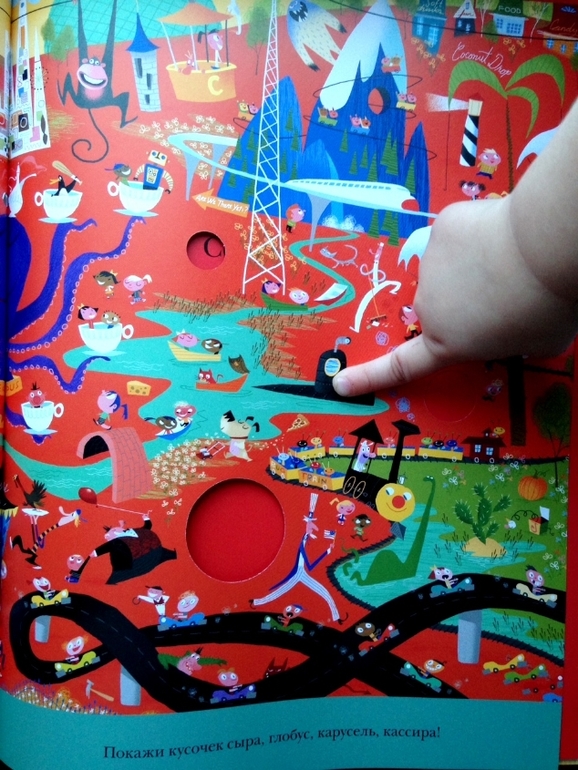 Долго думала, покупать эту книгу или нет, так как не в почете пока у нас виммельбухи, но все-таки решилась. Почему? Во-первых, иллюстрации выделяются из того, что нам уже знакомо, они индивидуальны и необычны, мне кажется, что именно в таком виде они близки детям. Ну и, конечно, поиск через отверстия, после книги 10 картин и красный мяч я поняла, что это наша «тема»)))