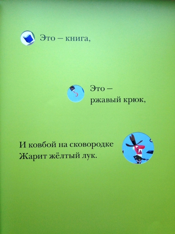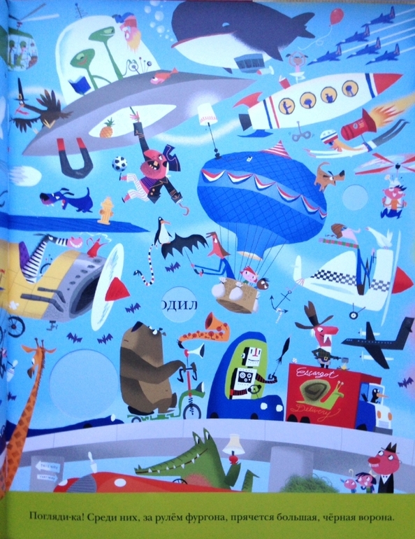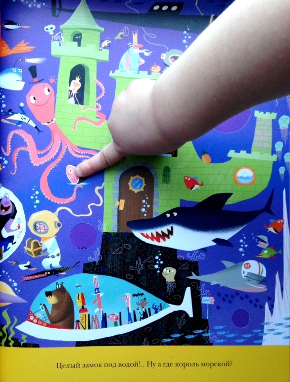 Это не просто классическая «гляделка», она особенная: в ней необходимо не просто найти определенные элементы в ворохе самых невообразимых рисунков, в ней нужно найти те элементы, что ты увидел через дырочки на предыдущем развороте. То есть на одной странице ты видишь отверстия, а в них, например, книгу, пирата и динозавра, а когда переворачиваешь страничку, тебе нужно найти эти же элементы, только уже в огромном количестве совершенно фантазийных и необычных рисунков. После того, как страница перевернута, внимание рассеивается, а герои «разбегаются» по своим местам в нарисованной истории, и нужно поднапрячься, чтобы сконцентрировать внимание именно на искомых элементах. Но занятие это очень забавное, моя дочь с удовольствием выискивает необходимое и попутно сочиняет истории такие же фантазийные истории о необычных героях книги. А герои здесь тоже необычные: роботы, динозавры, животные, пираты, транспорт, карусели, короли и принцессы, водолазы и акулы, и еще много-много других, вообщем все герои так любимые детьми.