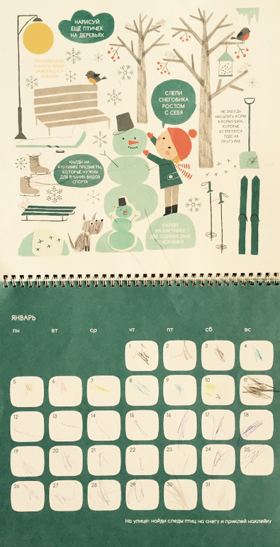 А еще на календаре для каждого месяца есть свои задания, такие как "дорисуй узор, нарисуй птичек на ветках, найди два одинаковых предмета". Есть и "долгоиграющие" - "посади какое-нибудь растение в горшок, устрой день добрых дел", а также те, которые можно выполнить на прогулках - "найди трех собак в зимних комбинезонах", "собери листья с пяти разных деревьев".