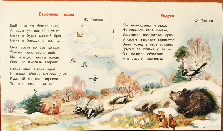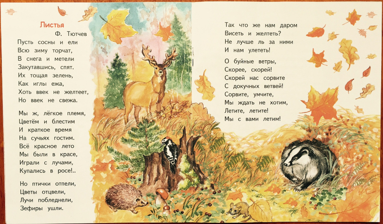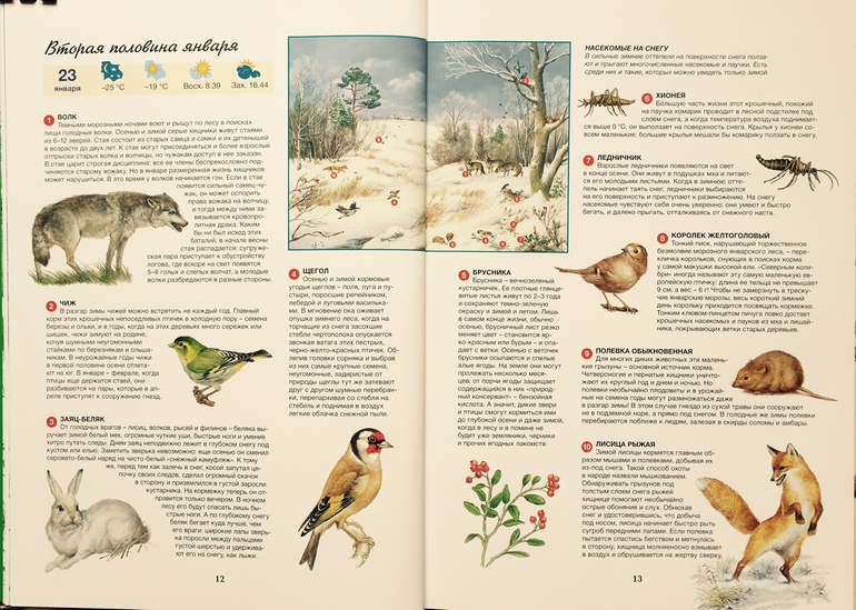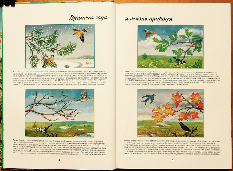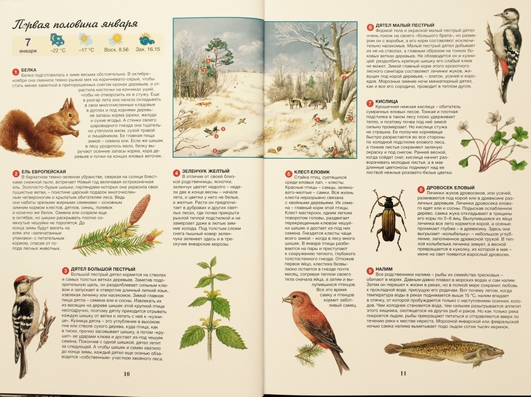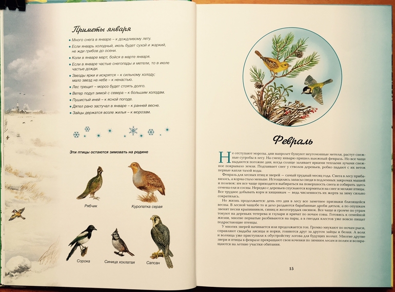 Сейчас пока мы просто рассматриваем крупные развороты, где изображен кусочек леса в разные месяцы года и наблюдаем, что изменилось, какие животные пришли, какие ушли/улетели. Если Олеся заинтересовывается каким-то животным, я ей читаю про это животное отсюда же, из энциклопедии, а если текст непростой, рассказываю своими словами. Еще мы любим читать про приметы каждого месяца. Со временем обратим внимание и на температурный режим, и подробнее остановимся на каждом животном и растении.