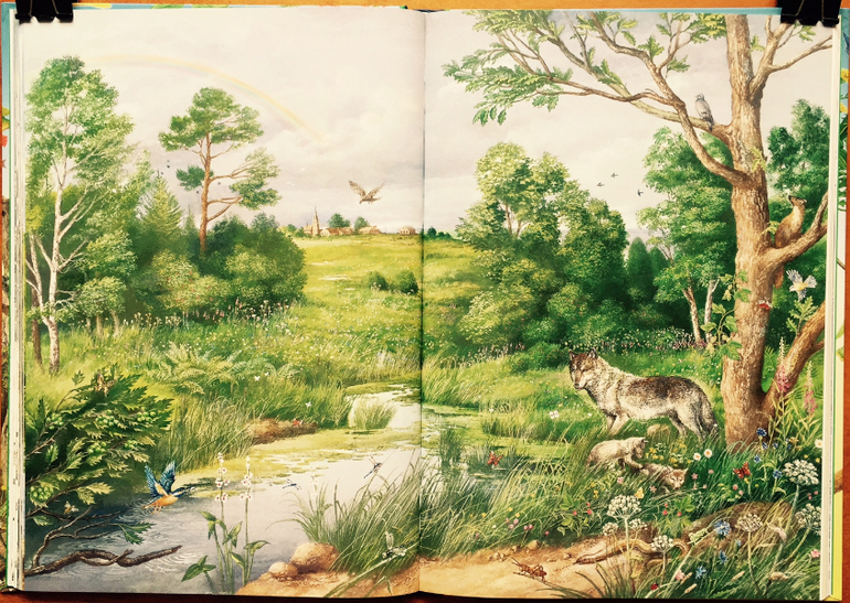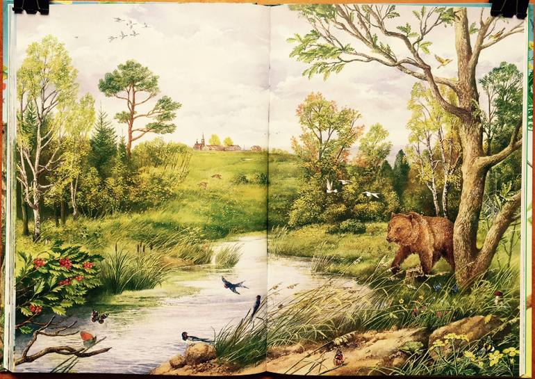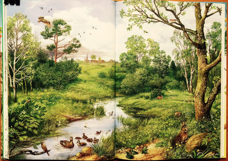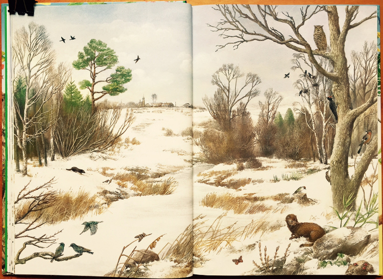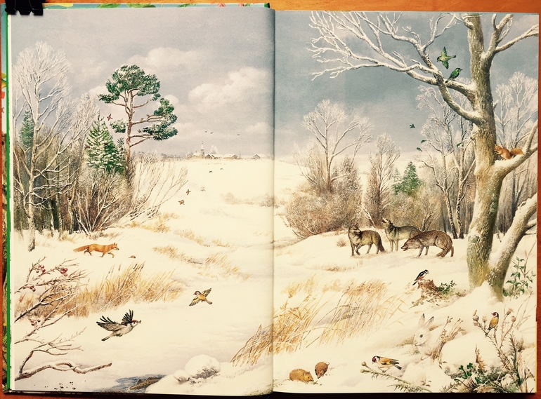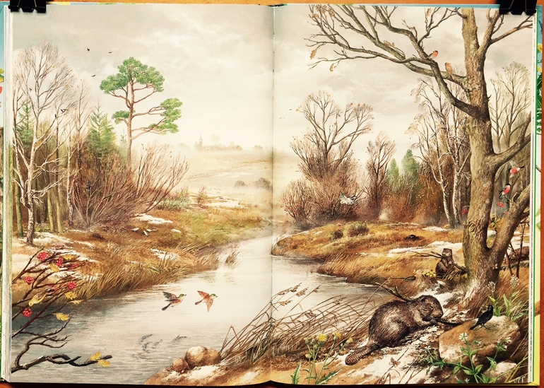Затем целый разворот занимает очень красивая зарисовка одного и того же участка леса, так, как он выглядит в текущий месяц, со всеми его обитателями, характерными для этого месяца. То есть, всего таких разворотов-картин получается 12 штук, и очень интересно наблюдать динамичное изменение природы в одном месте месяц за месяцем.