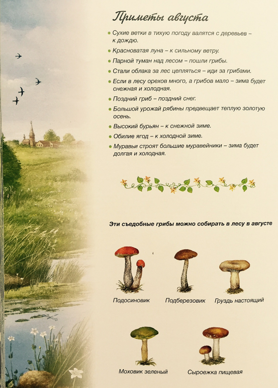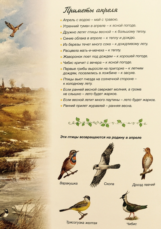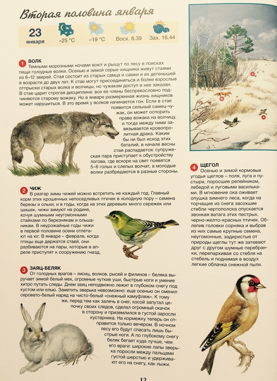 На последней странице, отведенной под текущий месяц, приводятся приметы месяца и даются интересные сведения о животном/растительном мире, характерные для этого месяца.